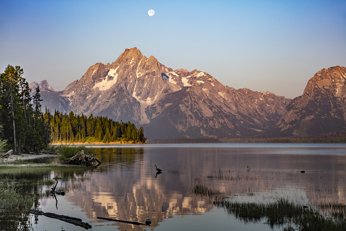 Moonset on Jackson Lake in the Grand Teton, Wyoming. We arose at 4:30 a.m. to get this image.