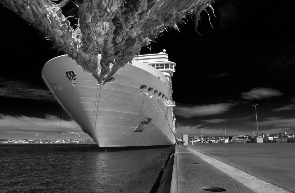 Before I describe the image itself, let me first add some information about the ship. This cruise ship, MSC Poesia, is one of the largest ships in its class. The length is 965 feet (294meters) and the beam (its width) is 32.2 meters. The displacement (the conventional way of measuring the weight of naval vessels) of the cruise ship is 89,900 tons, which provides space to hold more than 3,000 passengers and 987 crew members. MSC Poesia has 1,275 cabins for the guests and can reach a maximum speed of 23 knots. The ship is owned and operated by MSC Cruises, an Italian-Swiss shipping company.