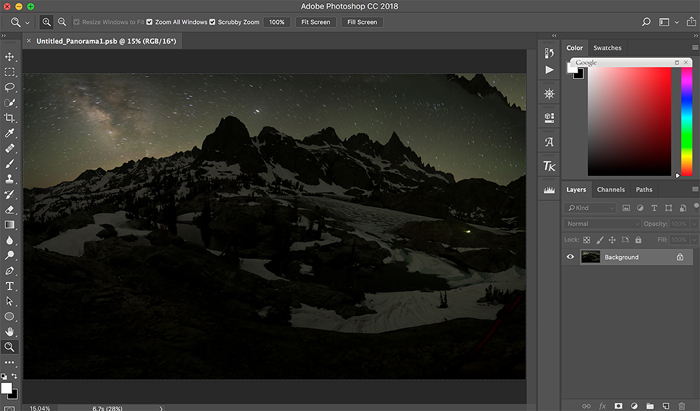 I shot 9 frames from right to left, covered about 150 degrees of view. I made sure that the each shot covered sufficient lower part of the foreground, as well as had about 40% overlap with the previous shot. This process took one hour to complete – each shot took 3 minutes exposure plus 3 minutes noise reduction, altogether 6 X 9 = 54 minutes.