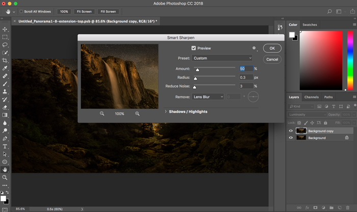 In the following, I started to sharpen the image by going “Filter =>Sharpen => Smart Sharpen…”. In Smart Sharpen dialog window, I set Amount 100%, Radius 0.3% and Reduce Noise 3%. After this sharpening, I did one more time Smart Sharpen, but this time reduced the amount to 50% and other parameters remained unchanged.