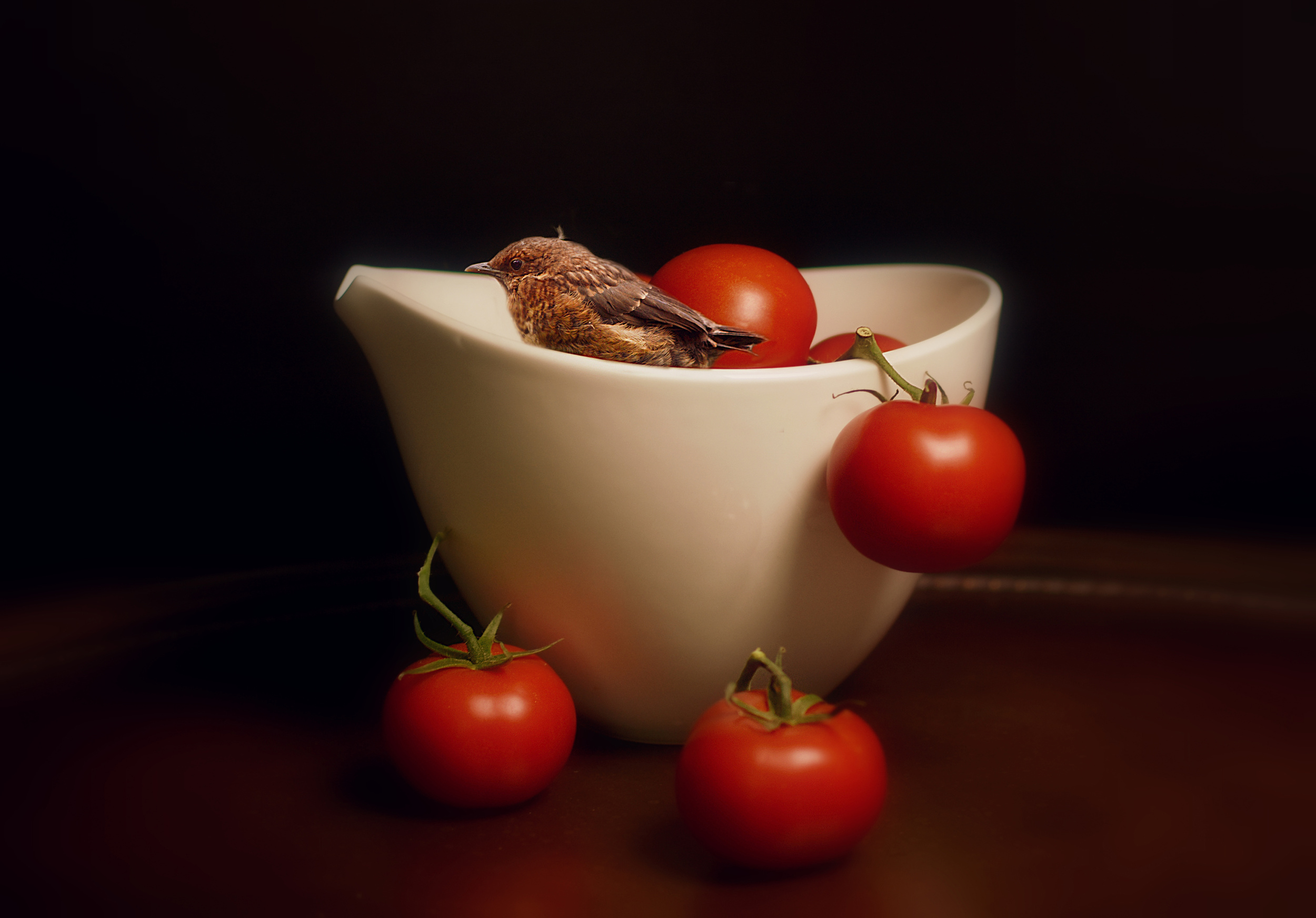 I named this photo “The little visitor” and it is a still life of a white china bowl with red tomatoes and a starling fledgeling. It was shot in natural light, just like all my still life scenes and I think it tells a story or several stories according to the viewer’s imagination. How did the bird get there, how did it get out. Are we insulated from winged creatures, do we really see and understand their world. Can we protect them. And so on.