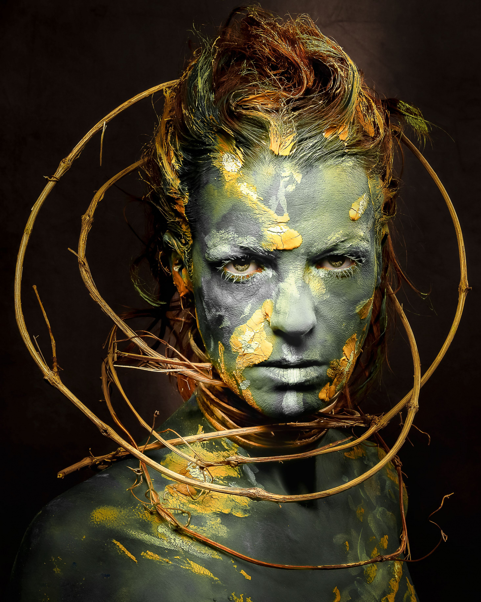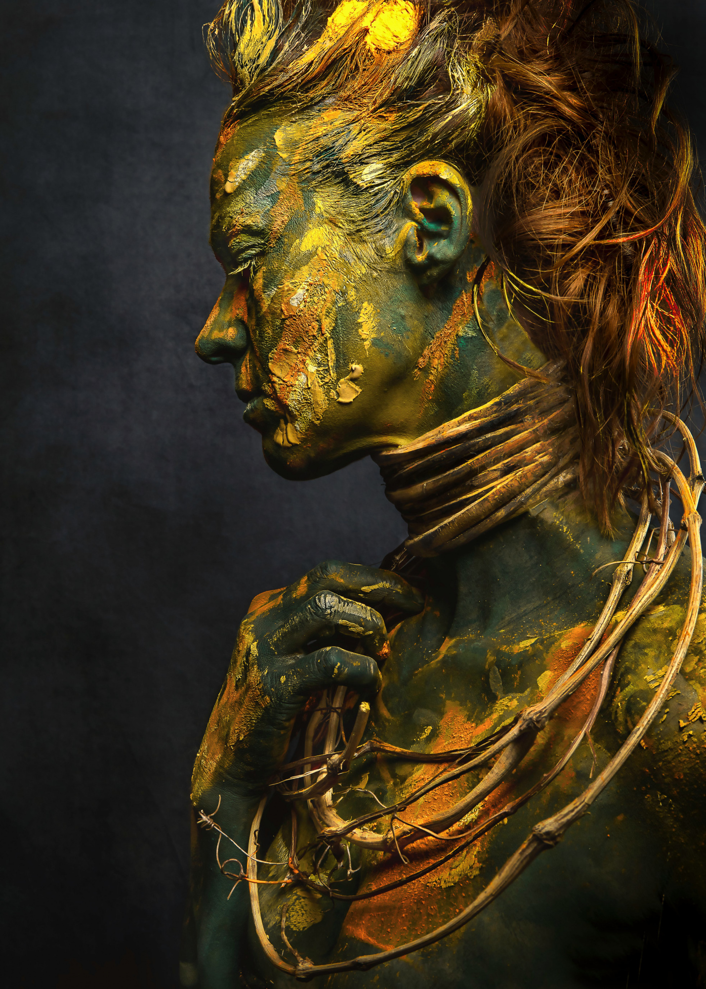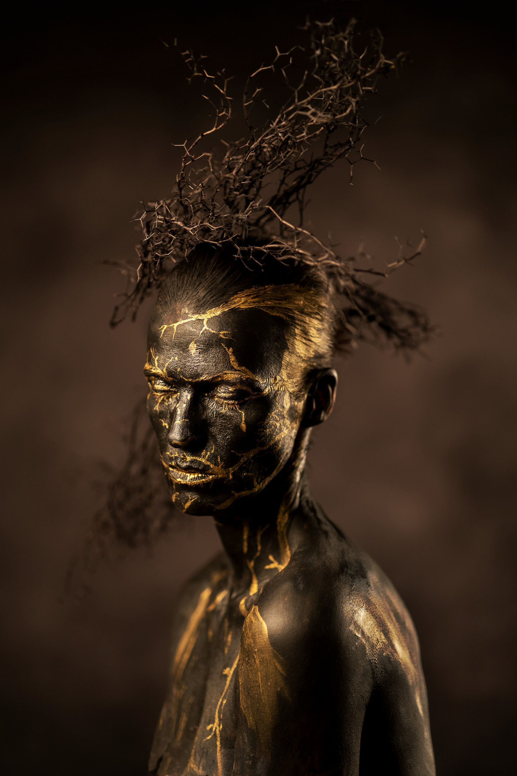 I am responsible for everything that happens in front of the camera. From the image idea to the complete implementation to the poses, I do everything on my own. In addition to the classic bodypainting I like to use materials from nature such as earth, mud, leaves, twigs, etc. and integrate them into my work. I use my body as my canvas and sculpture to turn my ideas into reality. And that is exactly the moment when my husband and photography come into play. But now it’s not just about simply capturing my form of art; the special challenge for him is to portrait my ideas in “the right light”. In the joint post-production we give our images the finishing touches.