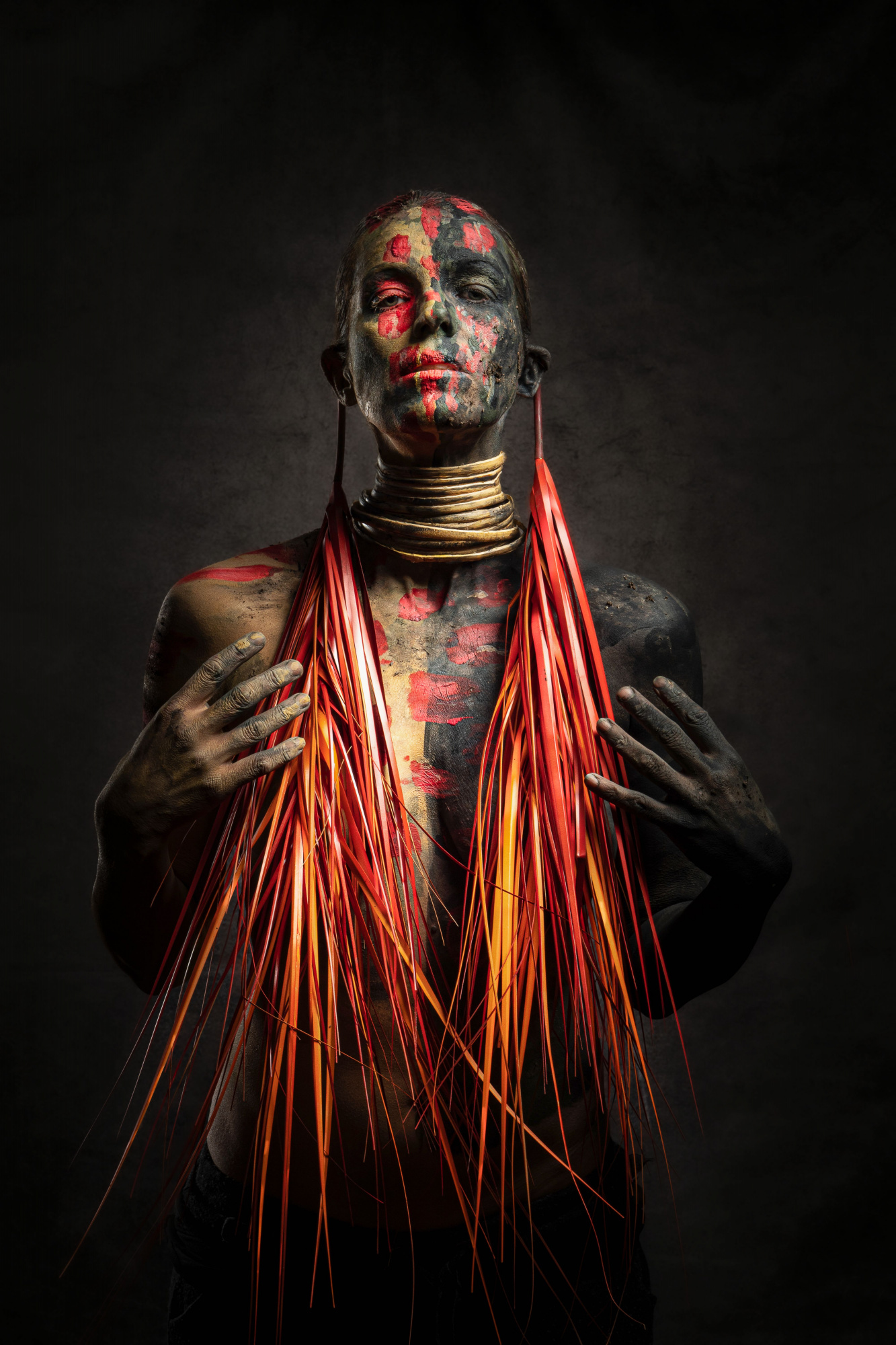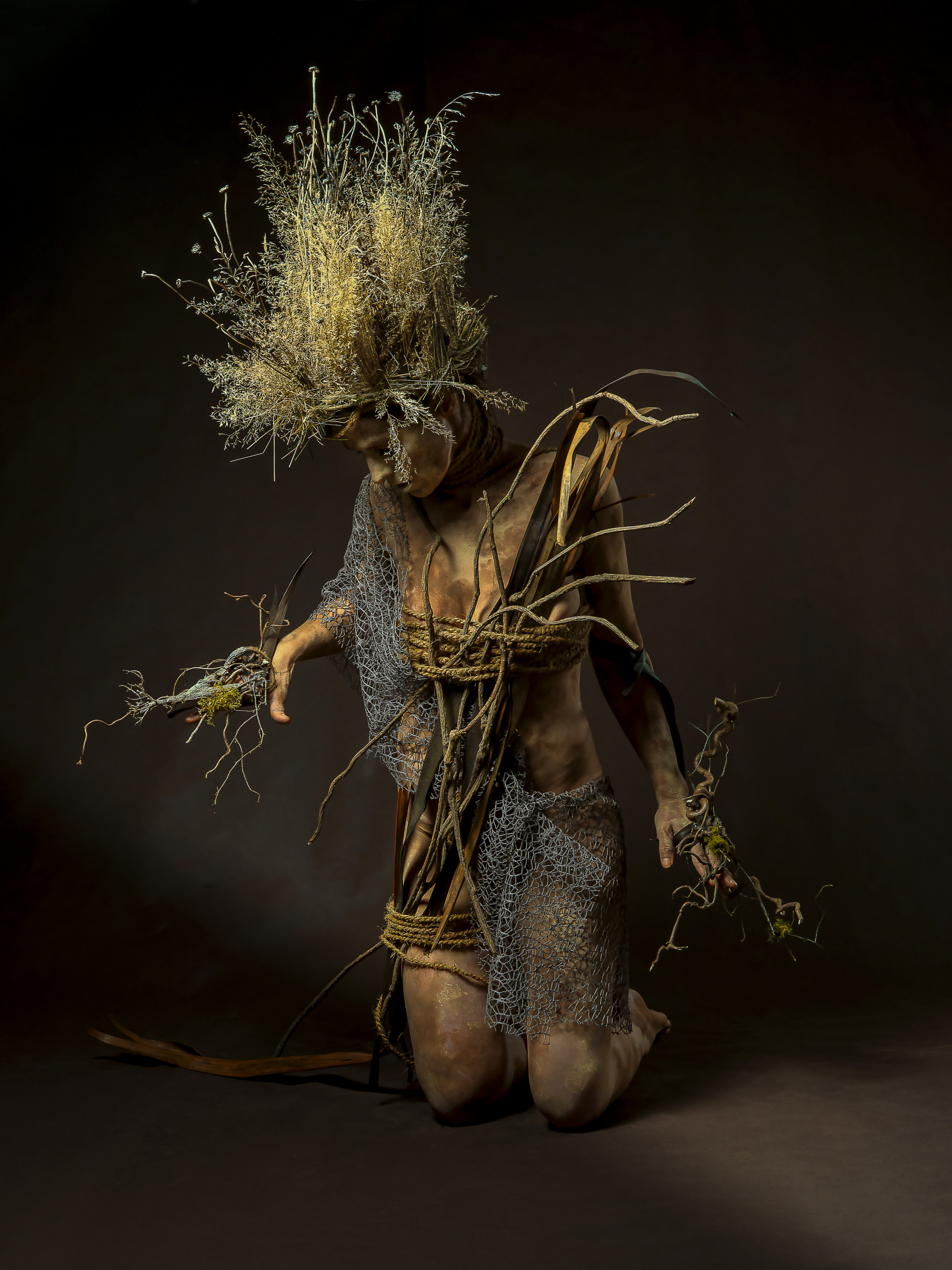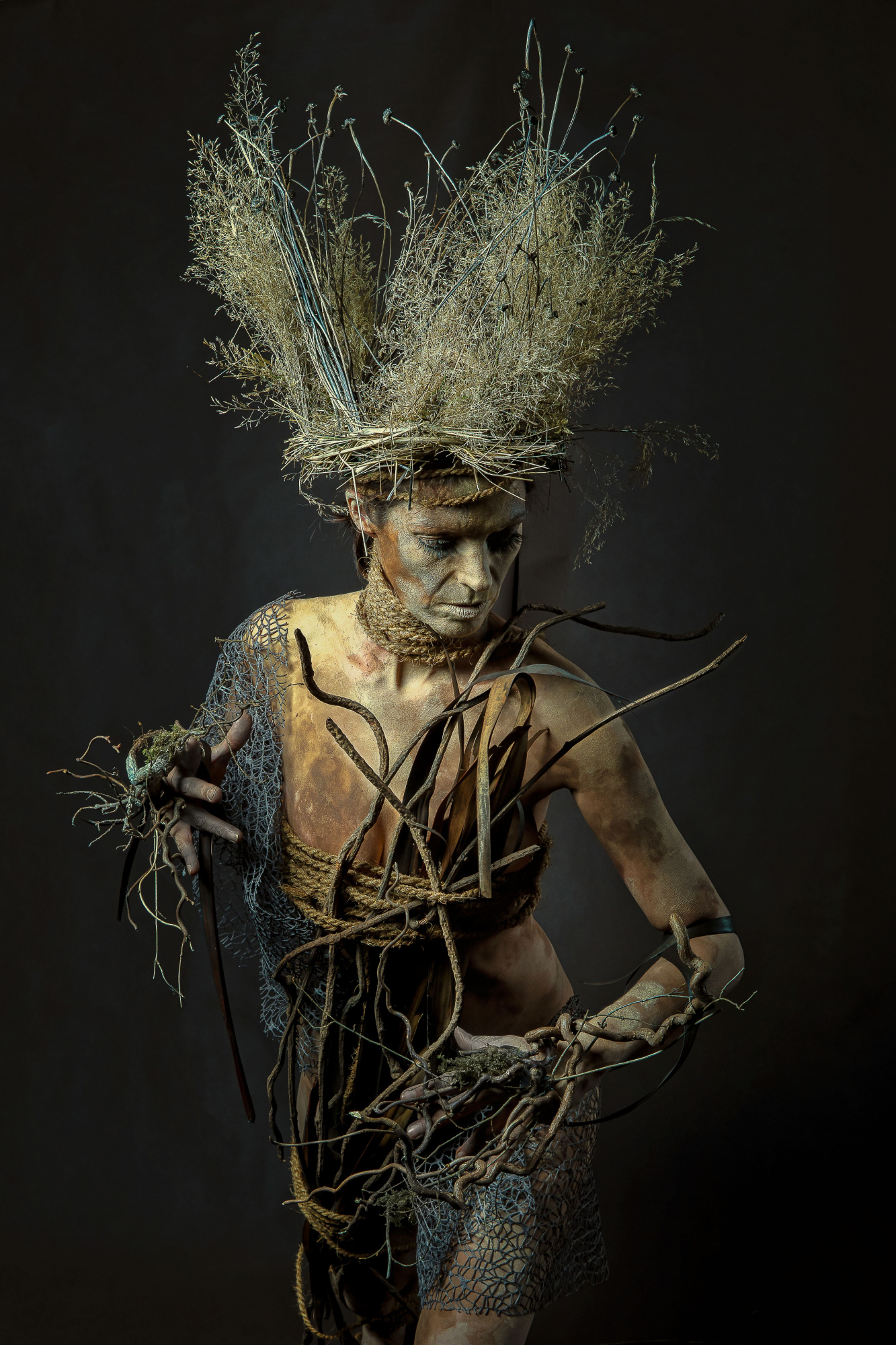 I am responsible for everything that happens in front of the camera. From the image idea to the complete implementation to the poses, I do everything on my own. In addition to the classic bodypainting I like to use materials from nature such as earth, mud, leaves, twigs, etc. and integrate them into my work. I use my body as my canvas and sculpture to turn my ideas into reality. And that is exactly the moment when my husband and photography come into play. But now it’s not just about simply capturing my form of art; the special challenge for him is to portrait my ideas in “the right light”. In the joint post-production we give our images the finishing touches.