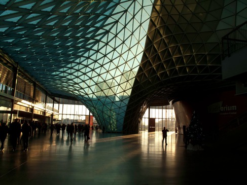 Every year during the first week of December in Milan, on the feast of St. Ambrose (the patron of the city), The Artisan Fair (L’Artigiano in Fiera) takes place. It’s a beautiful market that exhibits handicrafts from all around the world. The event is located on the Milan-Rho fairgrounds, and the building complex extends over half a mile (one kilometer) — it's one of the largest exhibition spaces in Europe. Designed by the famous architect Massimiliano Fuksas, it is covered by a wavy structure Fuksas calls the "Sail." It's an airy, transparent, netlike canopy made of glass and steel, which imitates the landscape of the snow-peaked Alps that can be seen in the distance. At some points the undulating structure exceeds 100 feet (30 m) and forms craters, waves, dunes and hills. It is quite an interesting photographic subject.