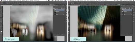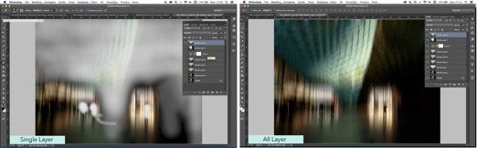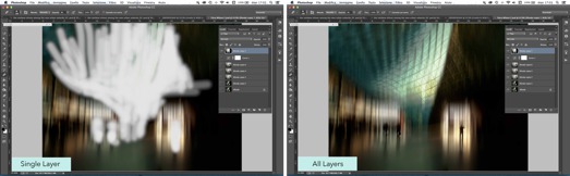 2) I made a copy of the Motion Blur layer, and using the Eraser tool with a soft brush and Opacity set to 8-10%, I gradually erased the specific areas that I wanted to be sharper in the image. By clicking on the eye beside the underlying layers in the Layers Panel, I was able to see exactly what I was erasing. The screenshot on the left shows what I erased with the other two layers turned off. The screenshot on the right shows two of the three layers turned on (the top and bottom layers) and what the Eraser tool revealed in the underlying original background layer.